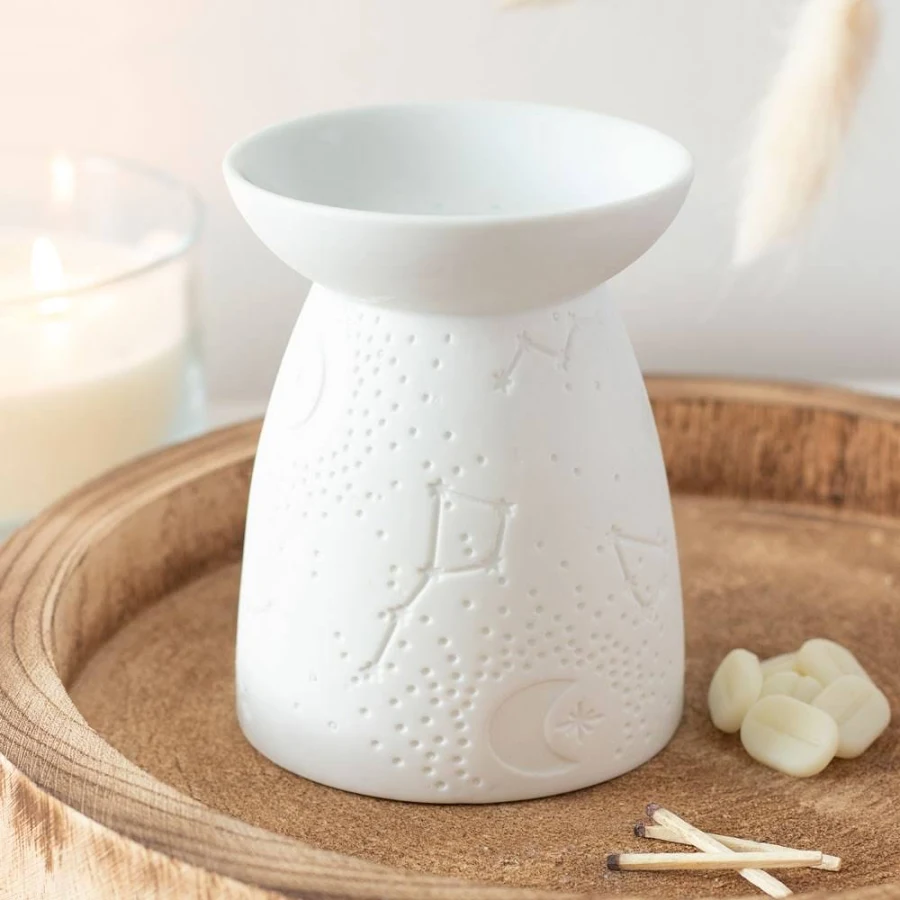 Laissez entrer les étoiles… Ce brûle-parfum décoré de constellations évoque les nuits douces et les rêves infinis. Idéal pour créer une atmosphère céleste et poétique, propice à l’évasion.