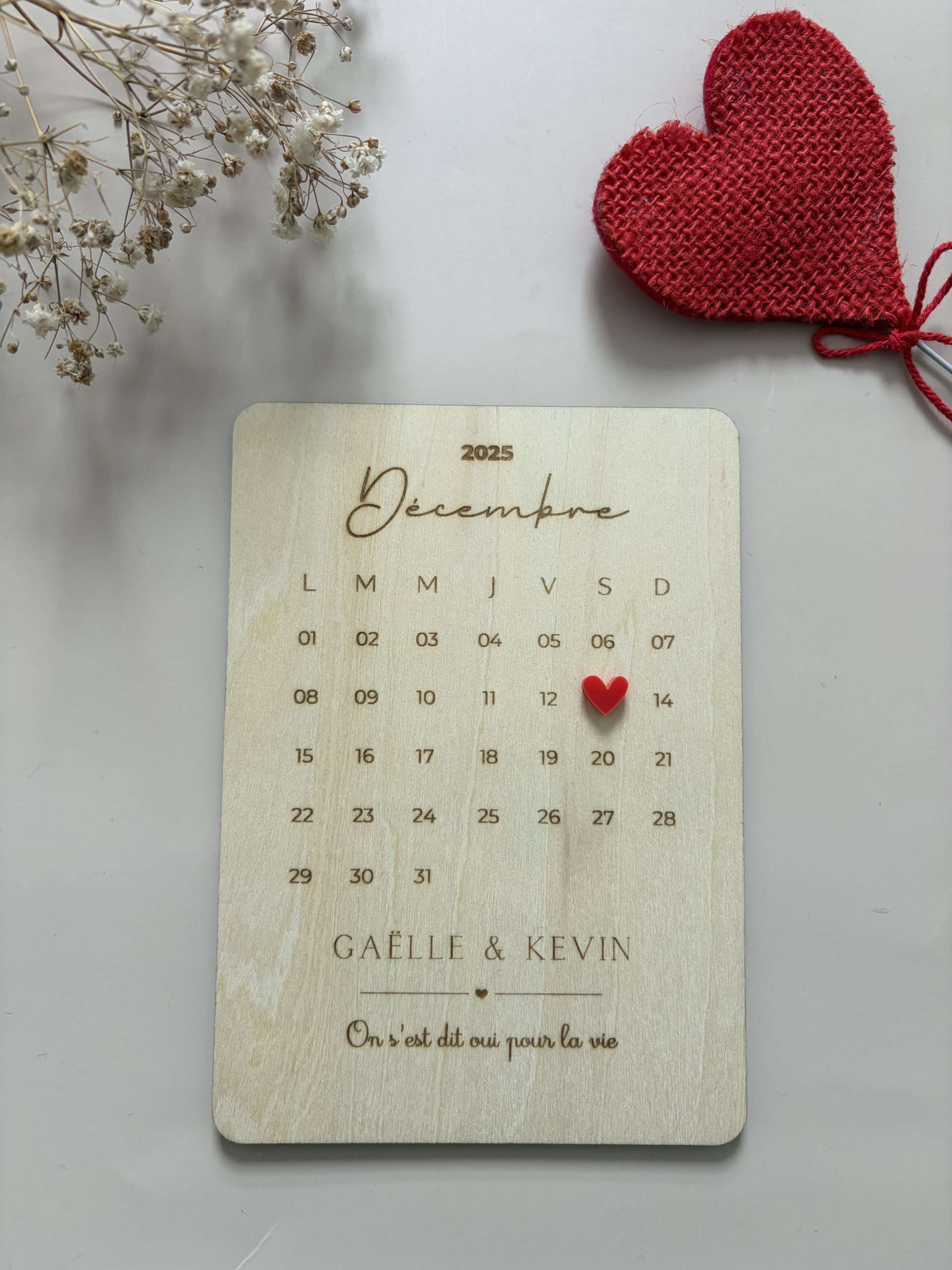 Le mois et l’année encadrent le calendrier, tandis qu’un petit cœur vient marquer la date choisie. les prénoms, une citation (que vous pouvez personnaliser) viennent sceller l’émotion de ce souvenir unique.