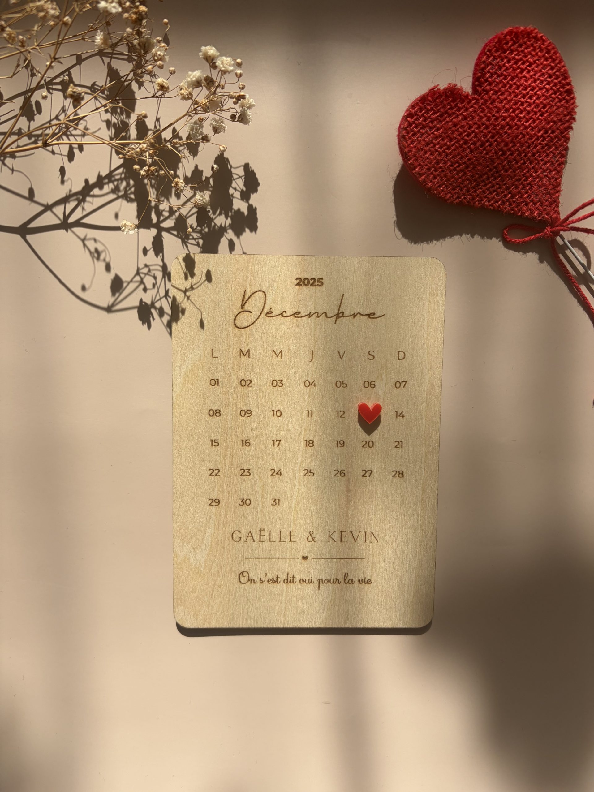 Cette plaque « calendrier » en bois de tilleul met à l’honneur une date symbolique: une rencontre, un mariage, une naissance, une demande… Ce moment suspendu que l’on souhaite garder près de soi pour toujours.