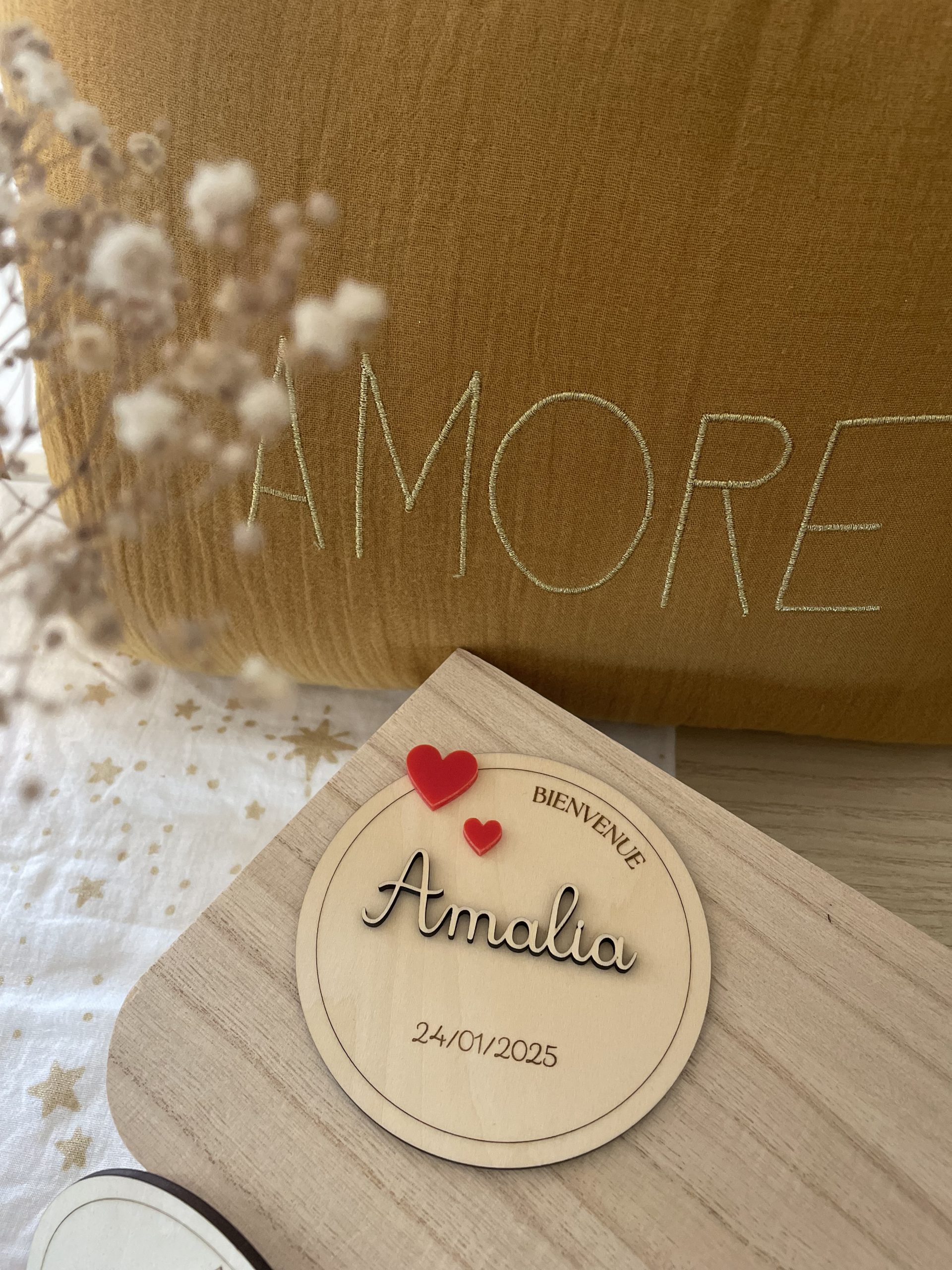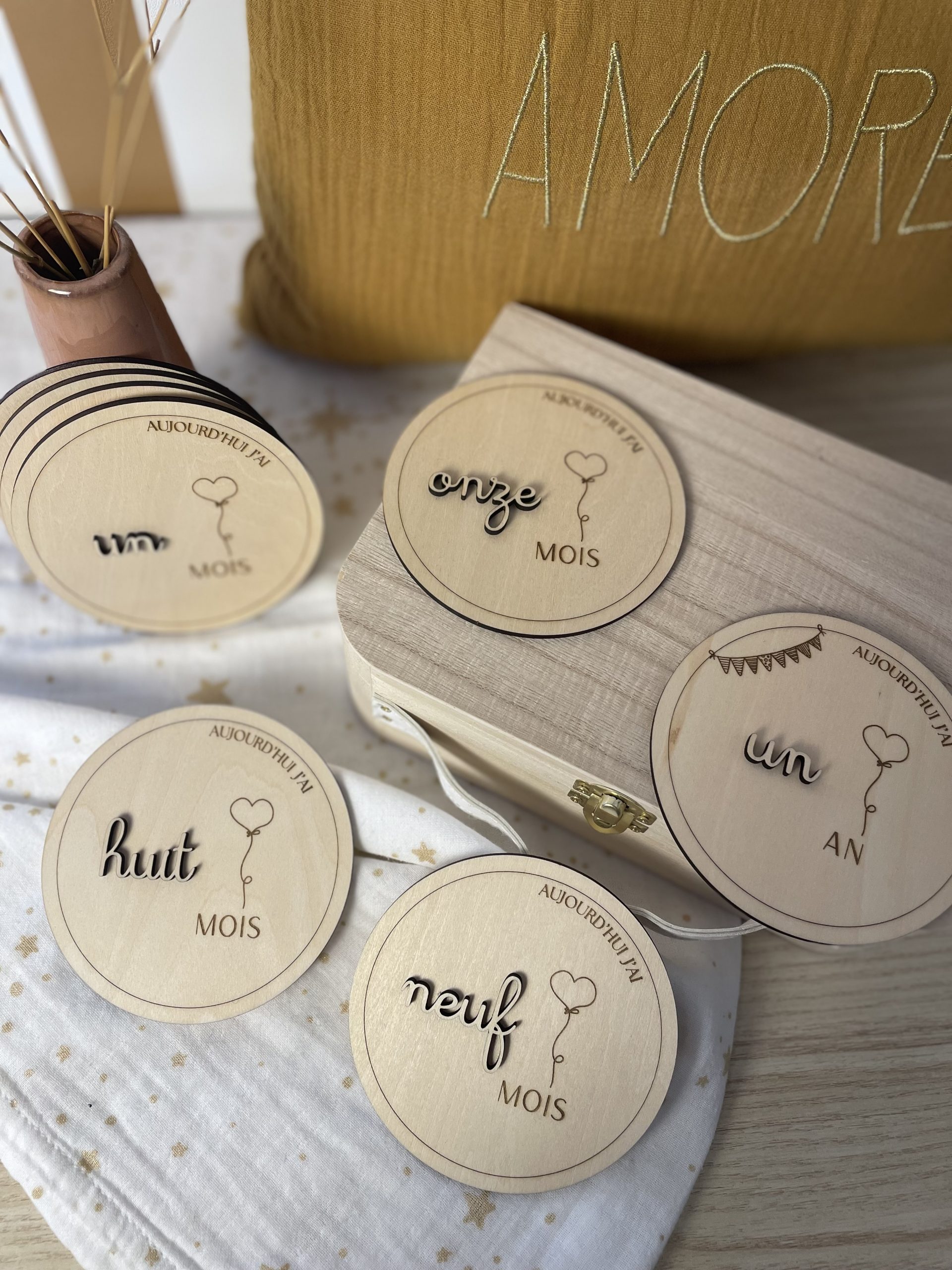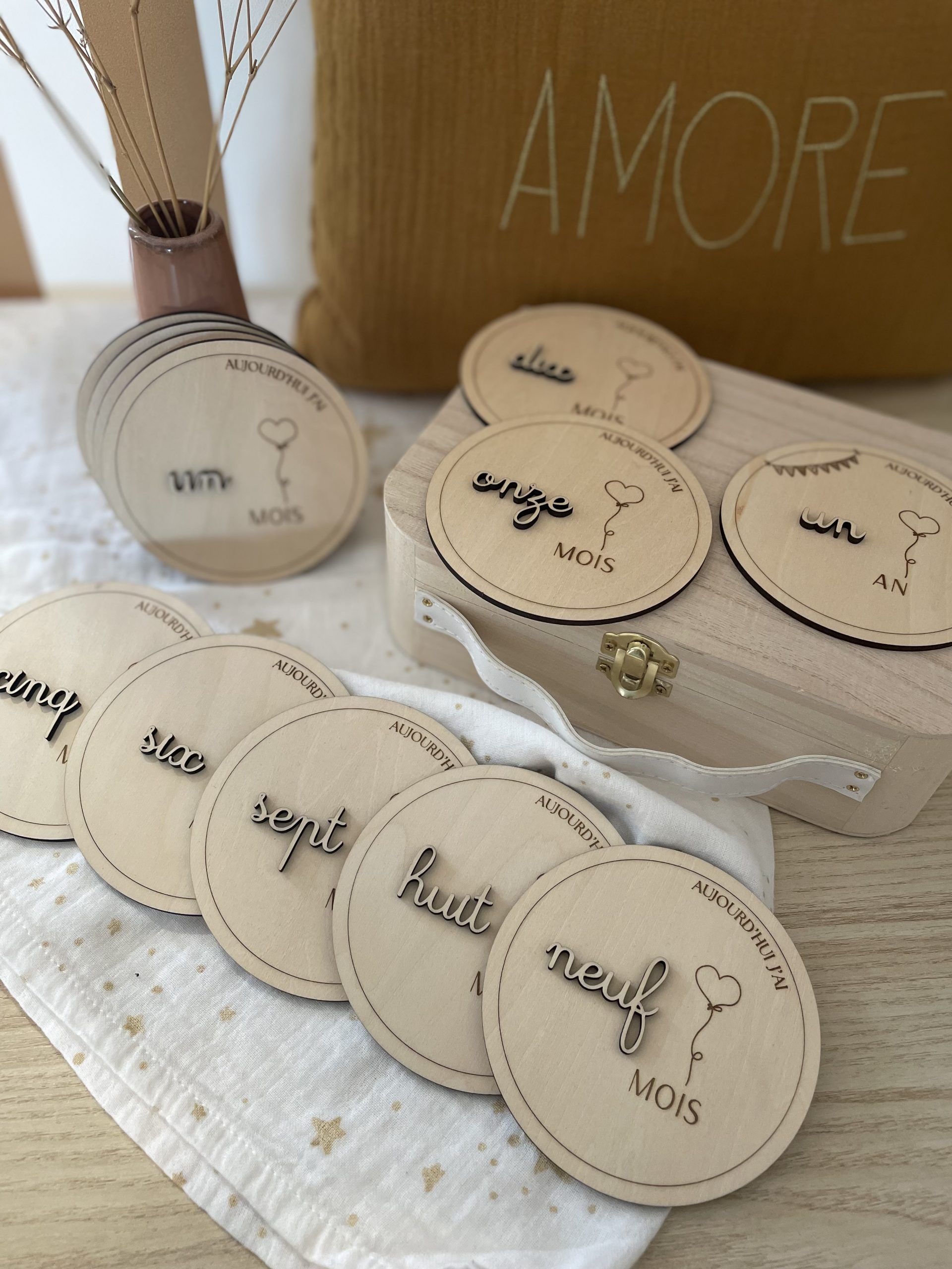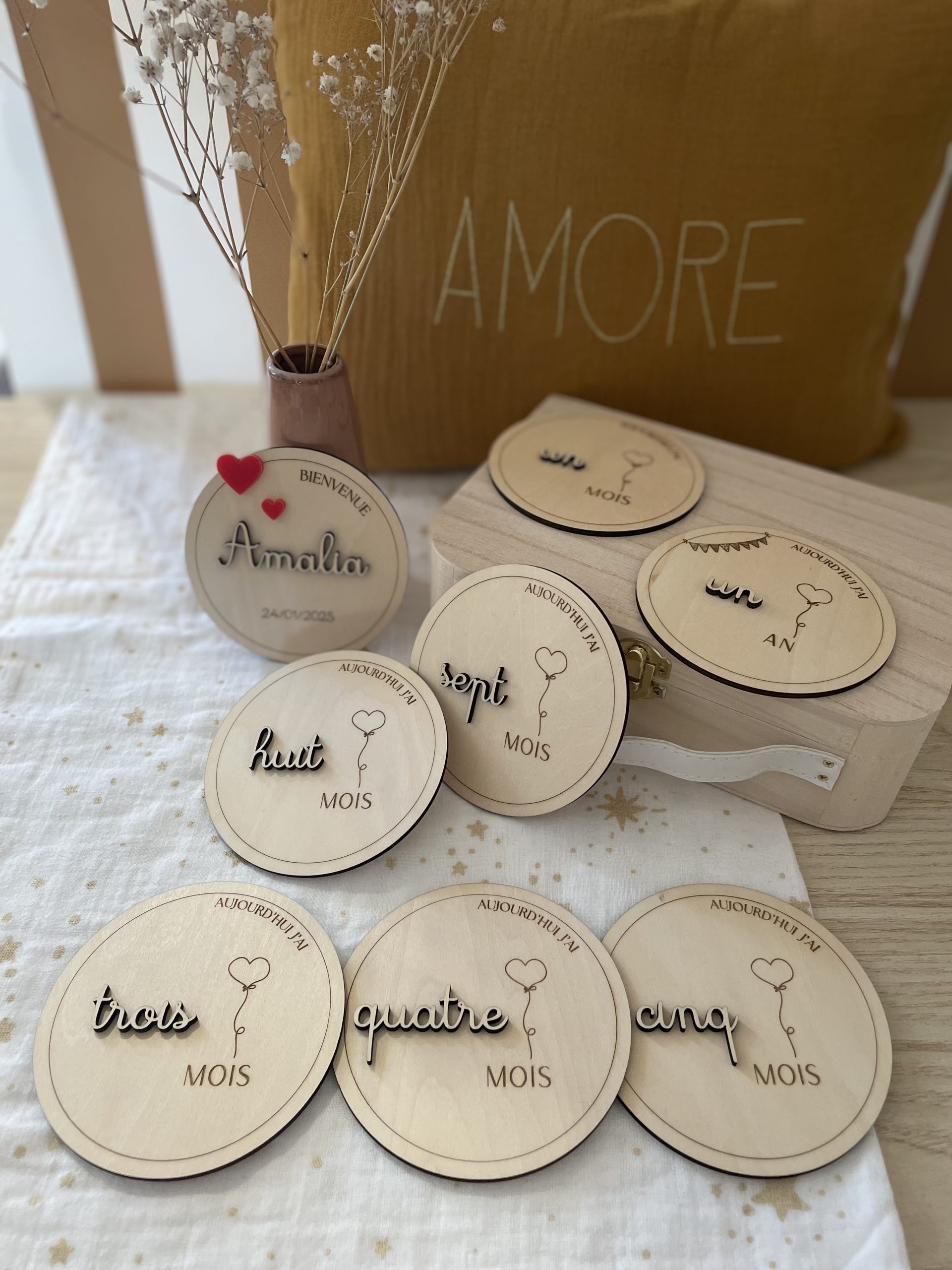 Il est possible également d’ajouter une 13ème carte de « BIENVENUE », personnalisée au prénom de votre bébé. Il est tout à fait possible également d’y ajouter la date de naissance ainsi que des informations telles que l’heure/le poids/la taille. Celle-ci est en forme de cercle avec deux cœurs en acrylique, le prénom en relief en bois de tilleul. Elle mesure également 10cm et viendra compléter à merveille ce joli coffret souvenir.