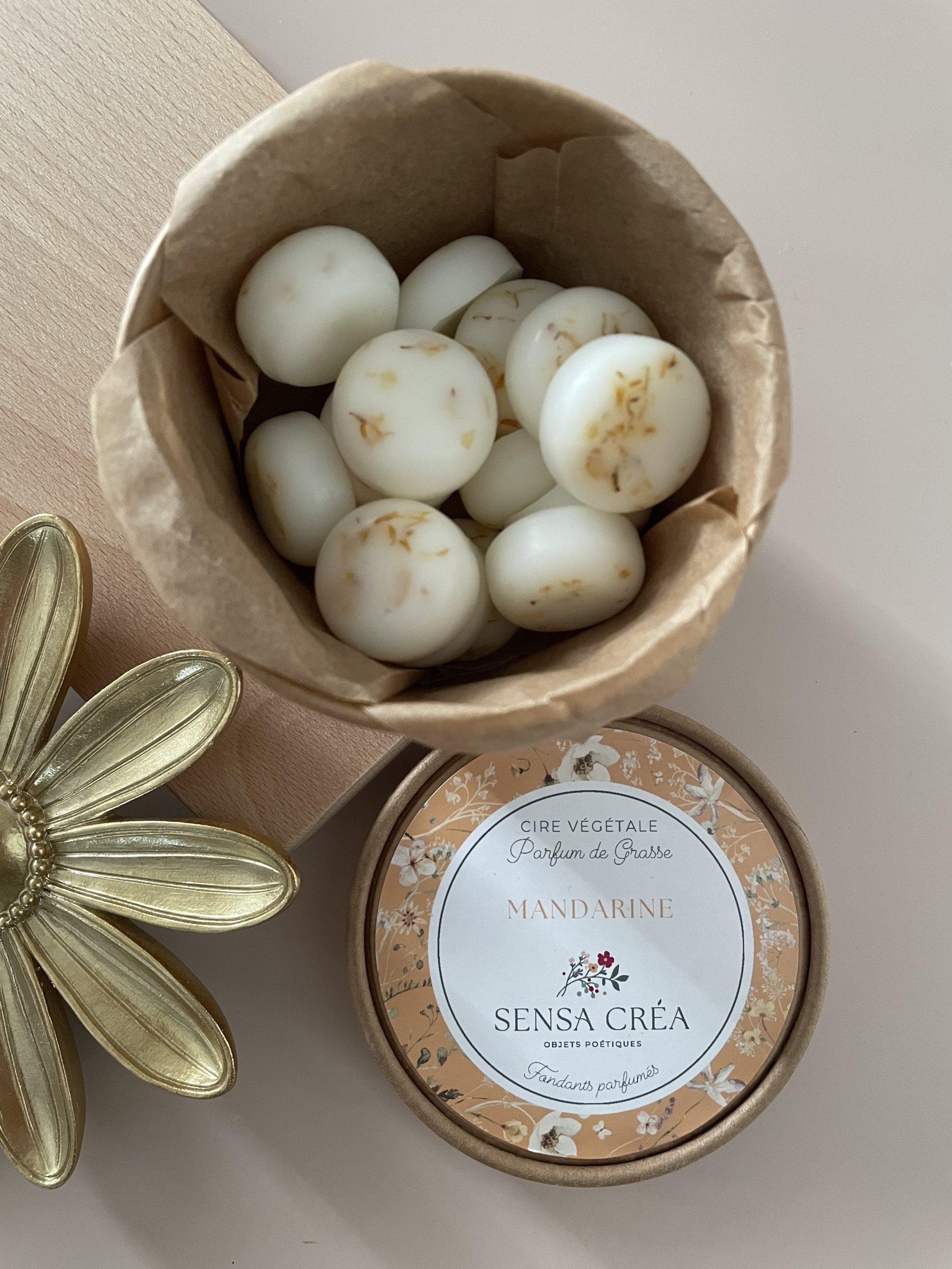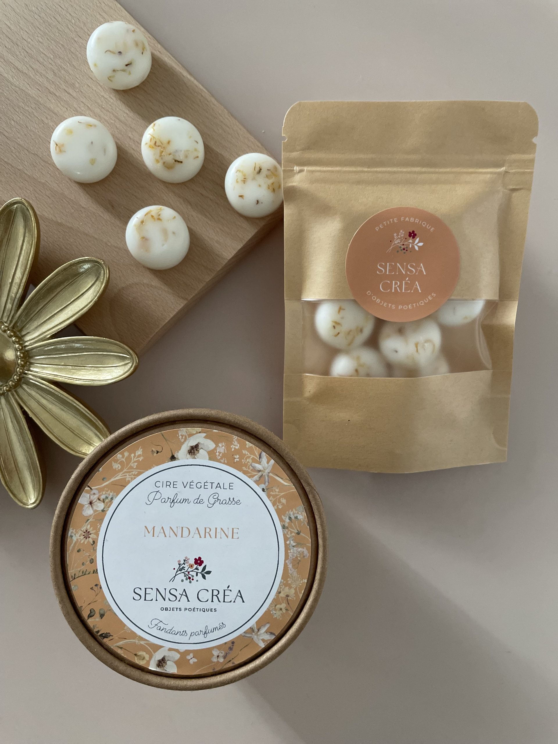 Apportez une touche de pep’s à votre intérieur avec nos fondants mandarine. Un parfum frais et pétillant, élaboré à Grasse sans CMR sans phtalates pour une diffusion saine et agréable. Ces fondants décorés de fleurs séchées sont coulés à la main dans mon atelier et réalisés en cire végétale. Le cadeau idéal pour (se) faire plaisir.