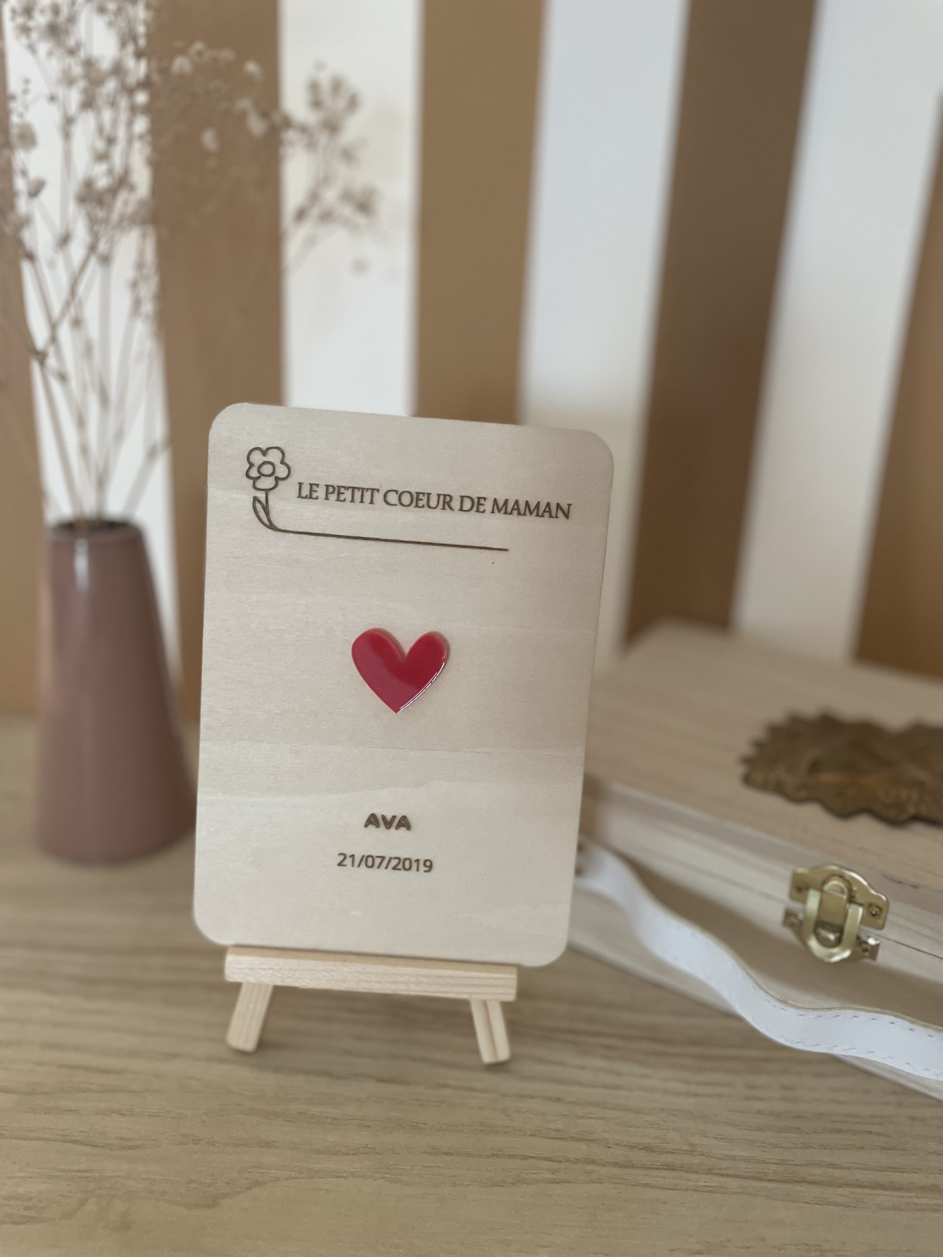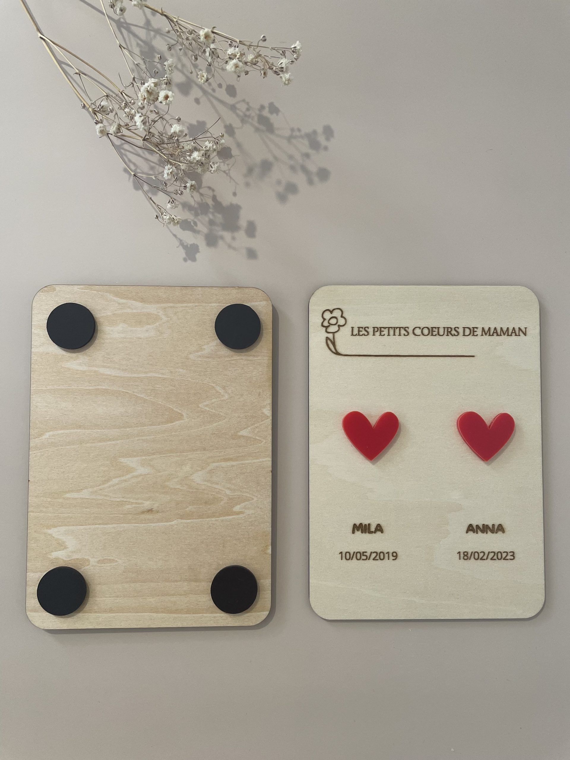 Cœurs en acrylique rouge avec en dessous le prénom et la date de naissance gravé sur le bois