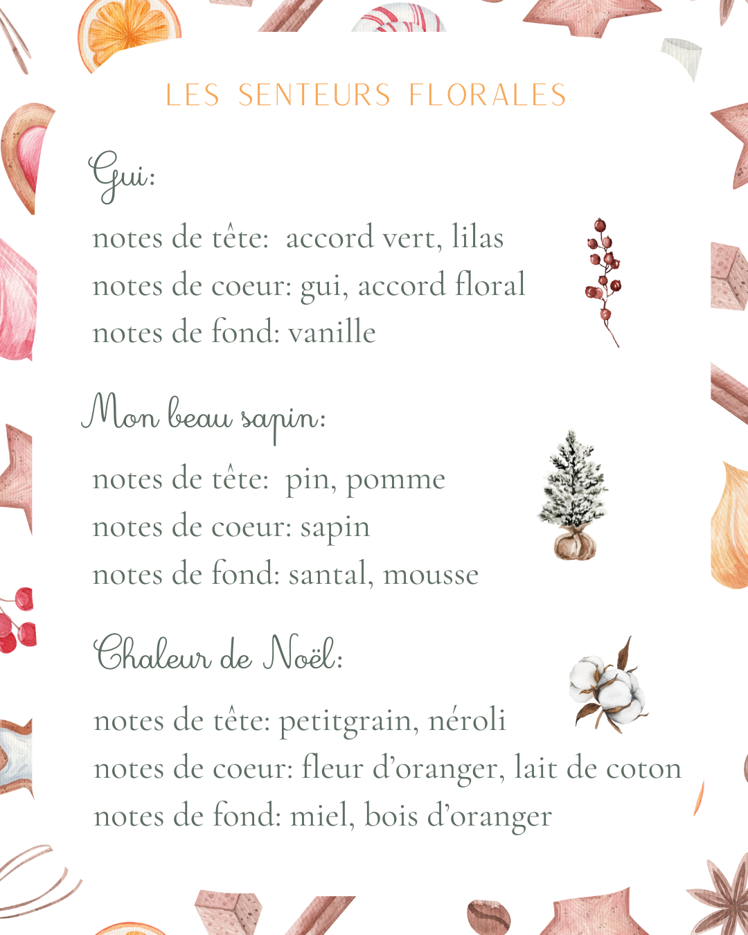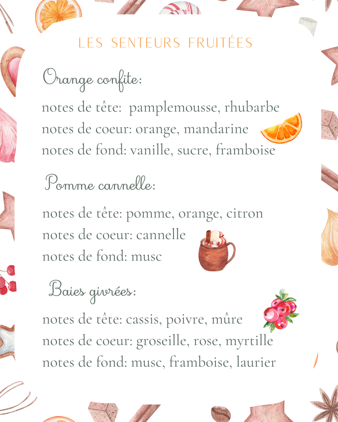 Elles diffusent des notes gourmandes et réconfortantes: pomme cannelle, nougat blanc, gui, sapin, orange confite, rocher praliné et bien d’autres.
