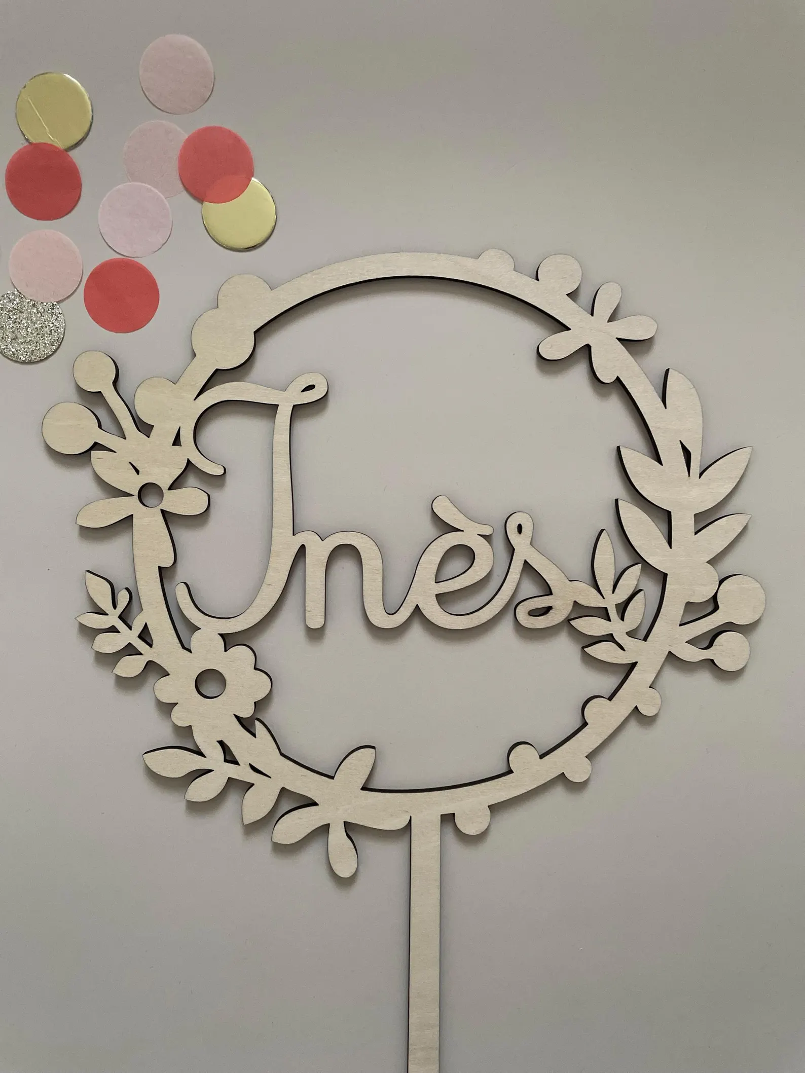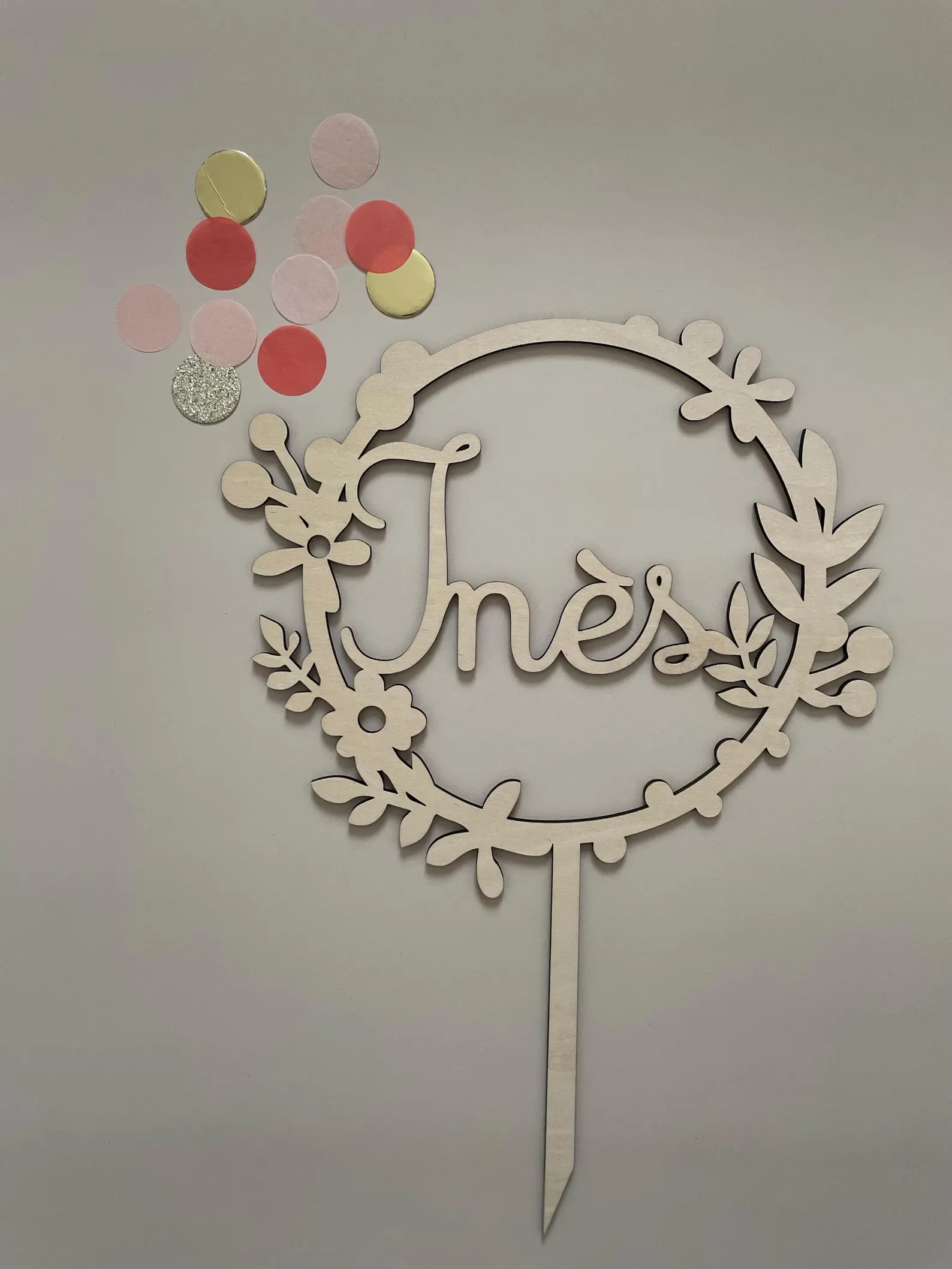 Ce topper cake en bois représente une délicate couronne fleurie entourant le prénom, découpé avec finesse au cœur de la composition. Son design épuré met à l’honneur la beauté du bois de tilleul et la simplicité élégante des formes végétales.